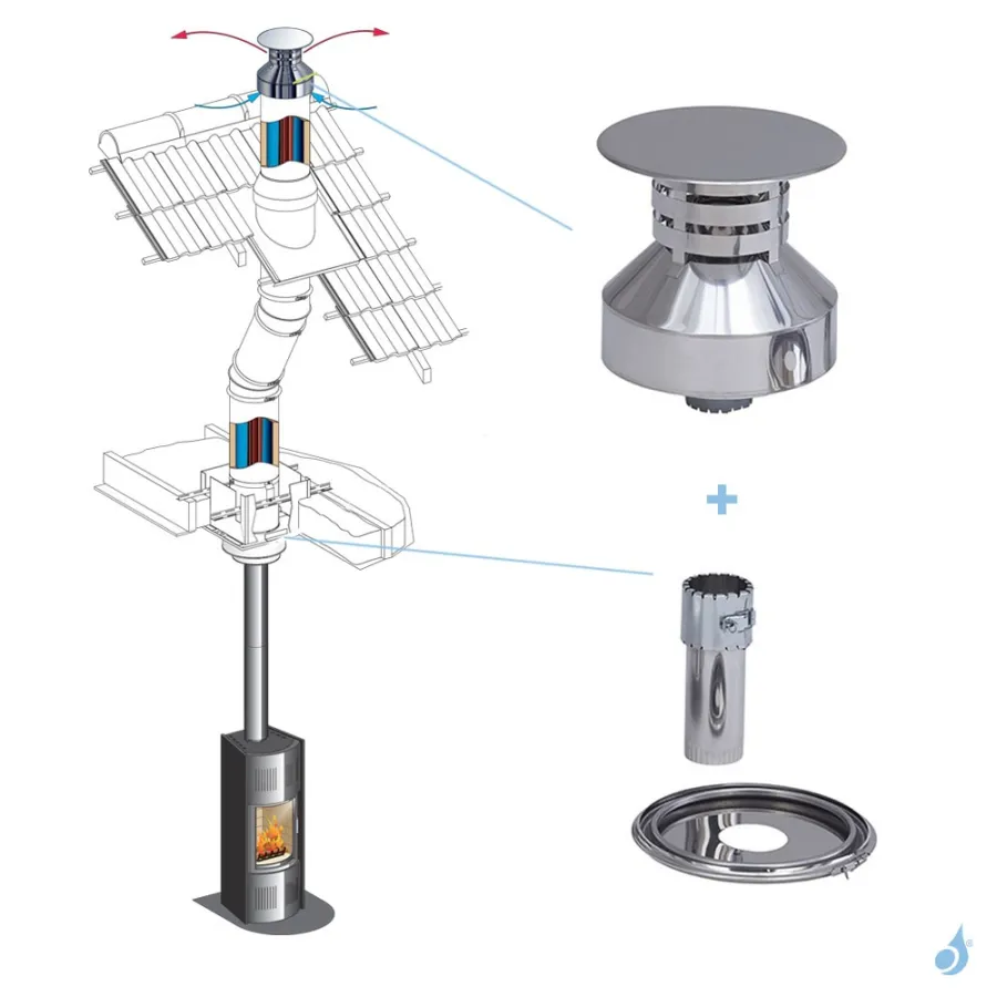 Nécessite un tubage double peau de Ø80 mm pour raccorder la partie basse et haute de votre conduit.