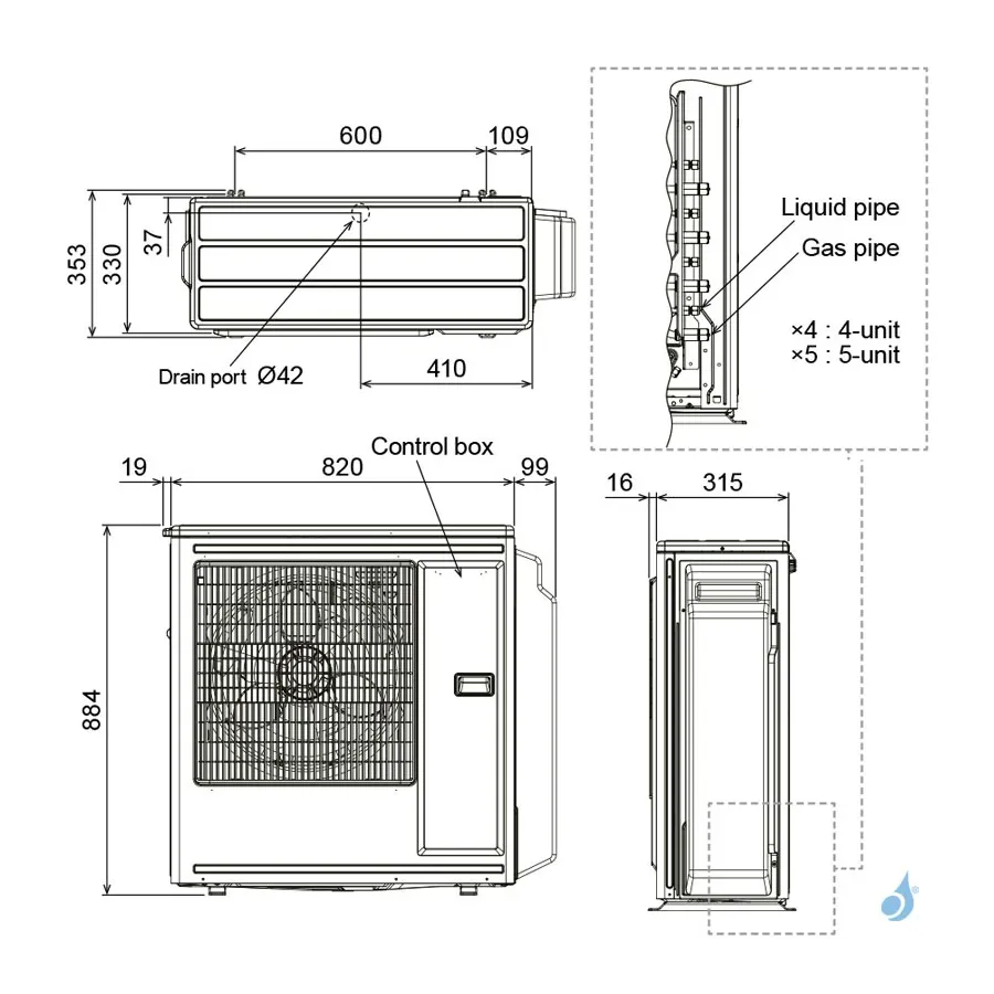 Dim. Unité Ext. HxLxP : 884 x 820 x 315 mm